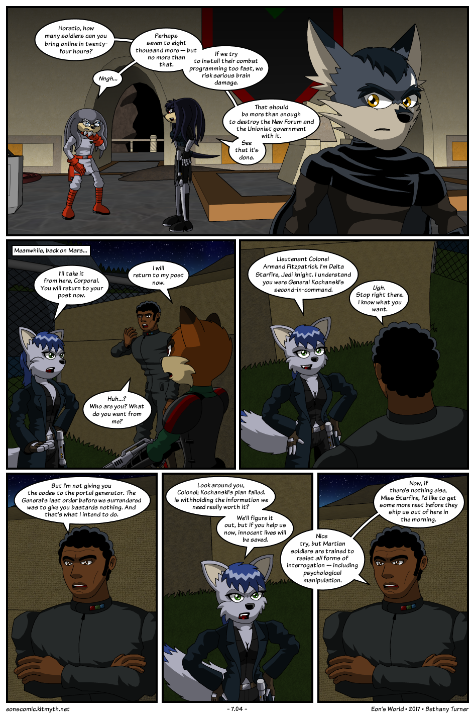 Commentary for January 18, 2020: If Eon is somewhere between Lawful Good and Neutral Good, Delta is somewhere between Neutral Good and Chaotic Good. She is a lot less hung up on whether she’s doing the right thing in the right way than Eon is and much more willing to do good by any means necessary -- even using a Jedi mind trick to get a guard to let her speak to a prisoner (assuming what’s happening in panel 2 wasn’t clear enough), which Eon would be much more reluctant to do. Maybe Eon and Delta represent the two conflicting halves of my own personality -- the idealistic side that wants the right decision to always be backed up by law and beneficent authority, but realises that it sometimes isn’t, and the side that doesn’t want to go out of its way to cross ethical lines, but will do so in a heartbeat if it serves the greater good. The side of me that says evil people should be removed from positions of power by legitimate means vs. the side that says, “Revolution! Bring out the guillotines!” I guess I should also talk about the fact that Fitz looks way more swole in this chapter than previous ones. I had been watching a metric heck ton of the DC animated series when starting on this chapter in 2016 (Batman, Superman, Justice League, etc.) and I was really inspired by the art style, which I decided to try and emulate, which meant humanoid men suddenly ended up being overly buff, whereas humanoid women ended up having an exagerrated hourglass figure. I’ve moved away from it a bit since, but the influence is still there even as recently as Chapter 10. |